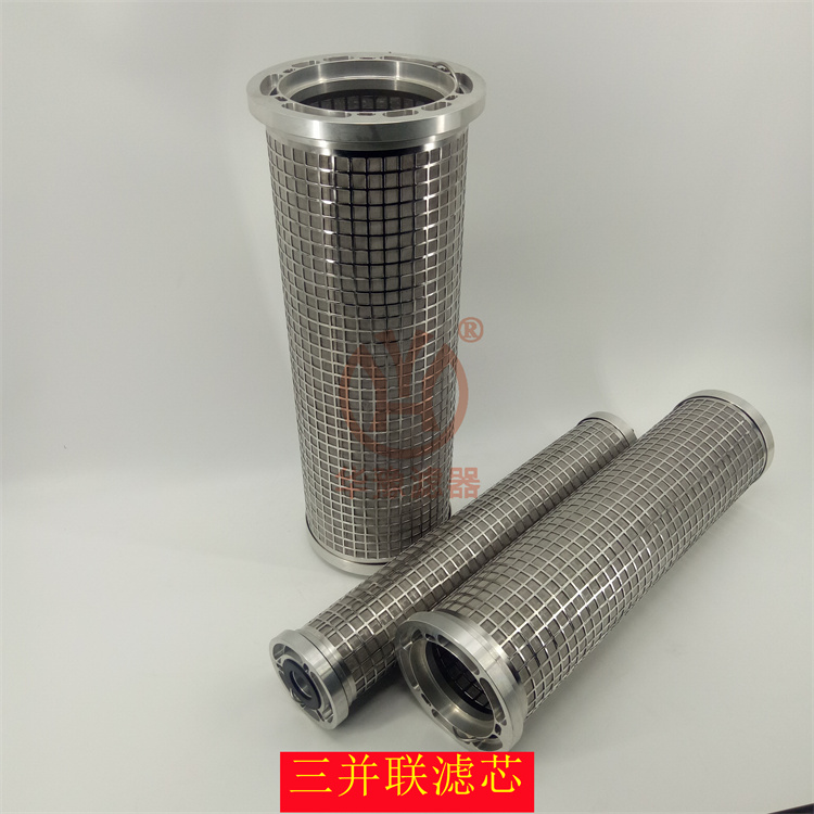 三并聯油濾芯是由從小到大幾個過濾器并聯在一起所組成,具有體積小、過濾面積大、拆裝簡單、清洗方便等特點,用于大流量液壓潤滑系統。
